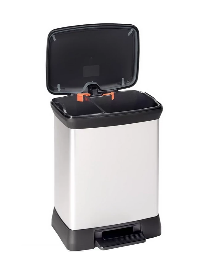 Fémes kinézetű, újrahasznosított műanyagból készülő pedálos hulladékgyűjtő. Eltávolítható belső kosarakkal. Kosarak mérete 11+18L